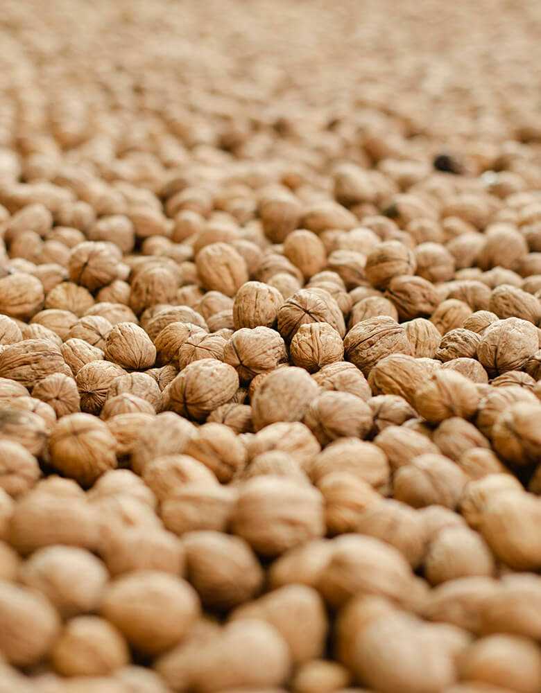 The outer green husk is removed by a huller and the nut is mechanically dehydrated (air-dried) to the optimum 8 % moisture level. This prevents deterioration of the nut and protects its quality during storage. Walnuts are stored until needed for cracking. California walnuts are protected from contamination because of the nut’s double envelope of hull and shell while on the tree.