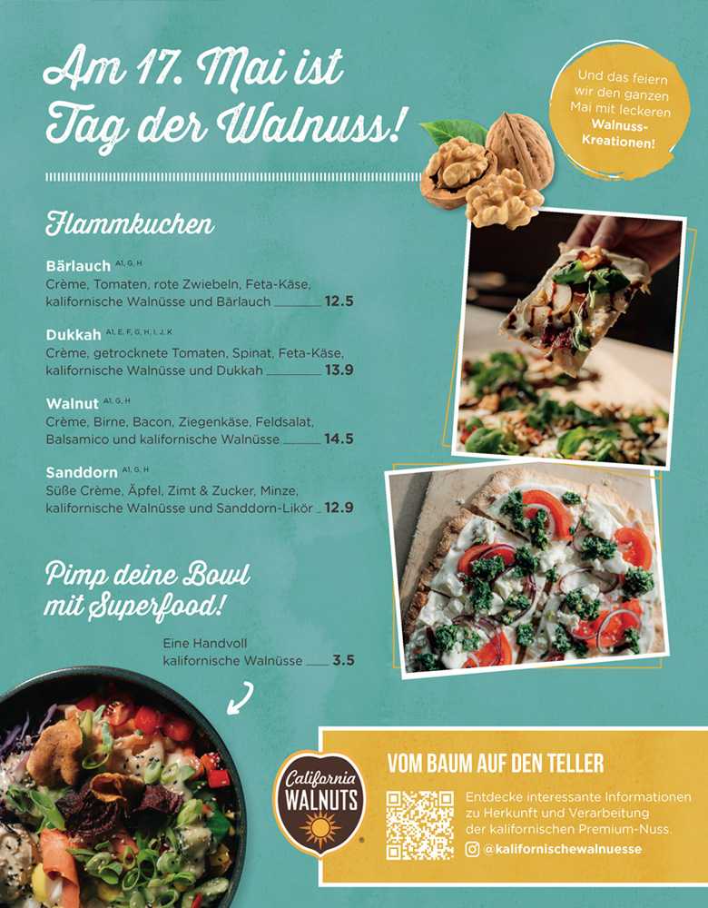 A perfect occasion to raise consumer awareness of California walnuts and stimulate sales in all channels. This year, the campaign day will be celebrated with numerous activities throughout the month of May. In addition to dedicated recipe specials on www.walnuss.de; newsletters and social media support, a large-scale gastronomy promotion will be implemented with Germany's top tarte flambée restaurant chain, Le Feu.